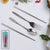 The 4-piece portable silverware set includes:  dinner fork, dinner spoon, chopsticks, carrying case. Suitable for travel, camp, school or workplace. Easy to clean